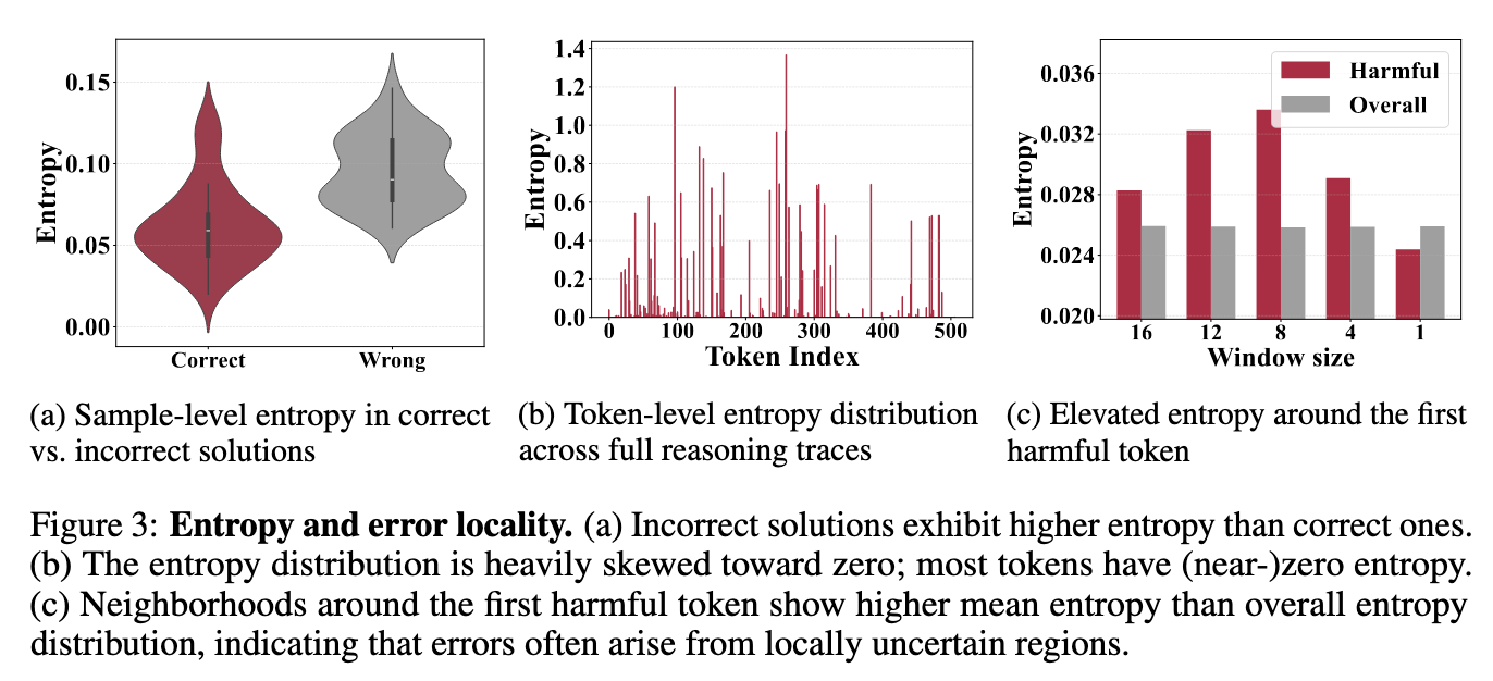 第三张图,定义有害 token 为首个使得 SLM 由正确转向错误的 token,发现有害 token 的熵要高于局部平均熵