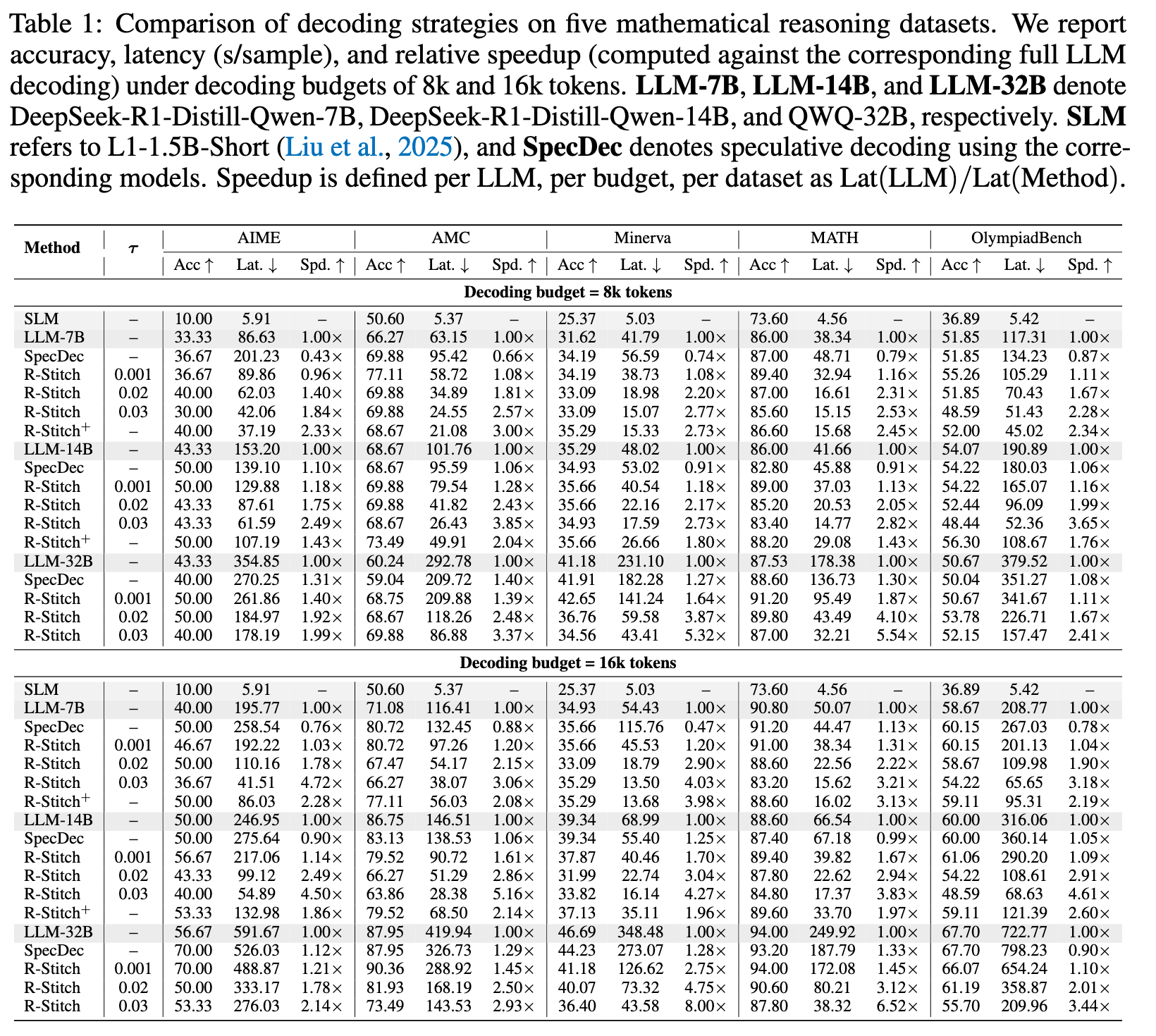 思维链(Chain-of-thought, CoT)能够增强大语言模型(LLMs)的问题求解能力,但由于其较长的自回归推理轨迹,带来了显著的推理开销。现有的加速策略要么通过提前终止或压缩来缩短推理路径,要么采用较小模型进行投机解码(speculative decoding)。然而,当模型间一致性较低时,投机解码的增益有限,并且严格强制执行 token 级别的对齐,忽略了这样一个观察:某些小模型在正确时能够生成显著更简洁的推理轨迹,从而可能减少推理长度。我们提出了 R-Stitch,一种无需训练的混合解码框架,利用 token 级别的熵作为不确定性的代理,在小型语言模型(SLM)与大语言模型(LLM)之间动态分配计算任务。我们的分析表明,高熵 token 更容易引发错误,这启发了我们设计一种基于熵的路由策略:让 SLM 高效处理低熵 token,而将不确定性较高的 token 交由 LLM 处理,从而避免完全回滚并保持答案质量。我们进一步扩展该设计,提出 R-Stitch+,其学习一种自适应路由策略,能够超越固定阈值动态调整 token 预算。通过同时降低每个 token 的解码复杂度和生成 token 的总数,我们的方法实现了显著的加速,且准确率损失可忽略不计。具体而言,在 DeepSeek-R1-Distill-Qwen-7B 上达到 3.00 倍的峰值加速,在 14B 模型上达到 3.85 倍,在 QWQ-32B 上达到 4.10 倍,同时保持与完整 LLM 解码相当的准确性。此外,该方法自然支持可调节的效率–准确性权衡,可根据不同的计算预算进行定制,无需重新训练。项目地址为 https://caesarhhh.github.io/R-Stitch。