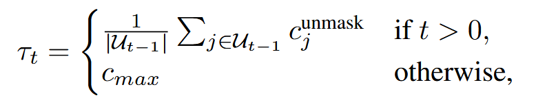 动态设置置信度阈值 tau_t,将其设置为之前步骤中 unmask 的 token 的平均置信度,c_max 是一个超参