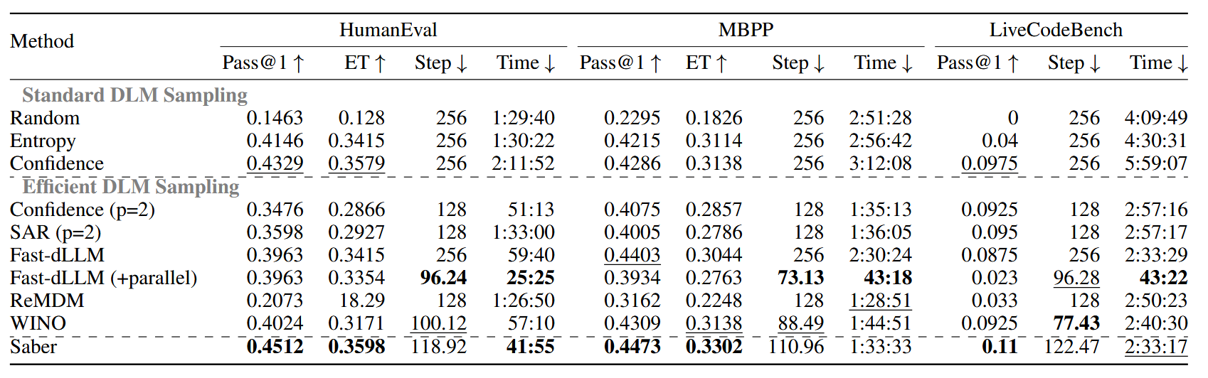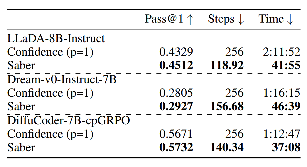 扩散语言模型(DLMs)正作为一种强大且有前景的替代方案,逐渐取代主流的自回归范式,在并行生成和双向上下文建模方面具有固有优势。然而,在代码生成任务中,由于更强的结构约束,DLMs 的性能受到推理速度与输出质量之间关键权衡的显著阻碍。我们观察到,通过减少采样步骤来加速代码生成过程通常会导致性能的灾难性下降。在本文中,我们引入了一种新的无需训练的采样算法——自适应加速与回溯增强重掩码(即 Saber),用于 DLMs 以在代码生成中实现更好的推理速度和输出质量。具体而言,Saber 受到 DLM 生成过程中的两个关键洞察启发:1)随着更多代码上下文的建立,可以自适应地加速;2)需要一个回溯机制来逆转生成的标记。在多个主流代码生成基准上的广泛实验表明,Saber 在主流 DLM 采样方法上平均提升了 1.9% 的 Pass@1 准确率,同时实现了平均 251.4% 的推理加速。通过利用 DLMs 的固有优势,我们的工作显著缩小了代码生成中与自回归模型之间的性能差距。