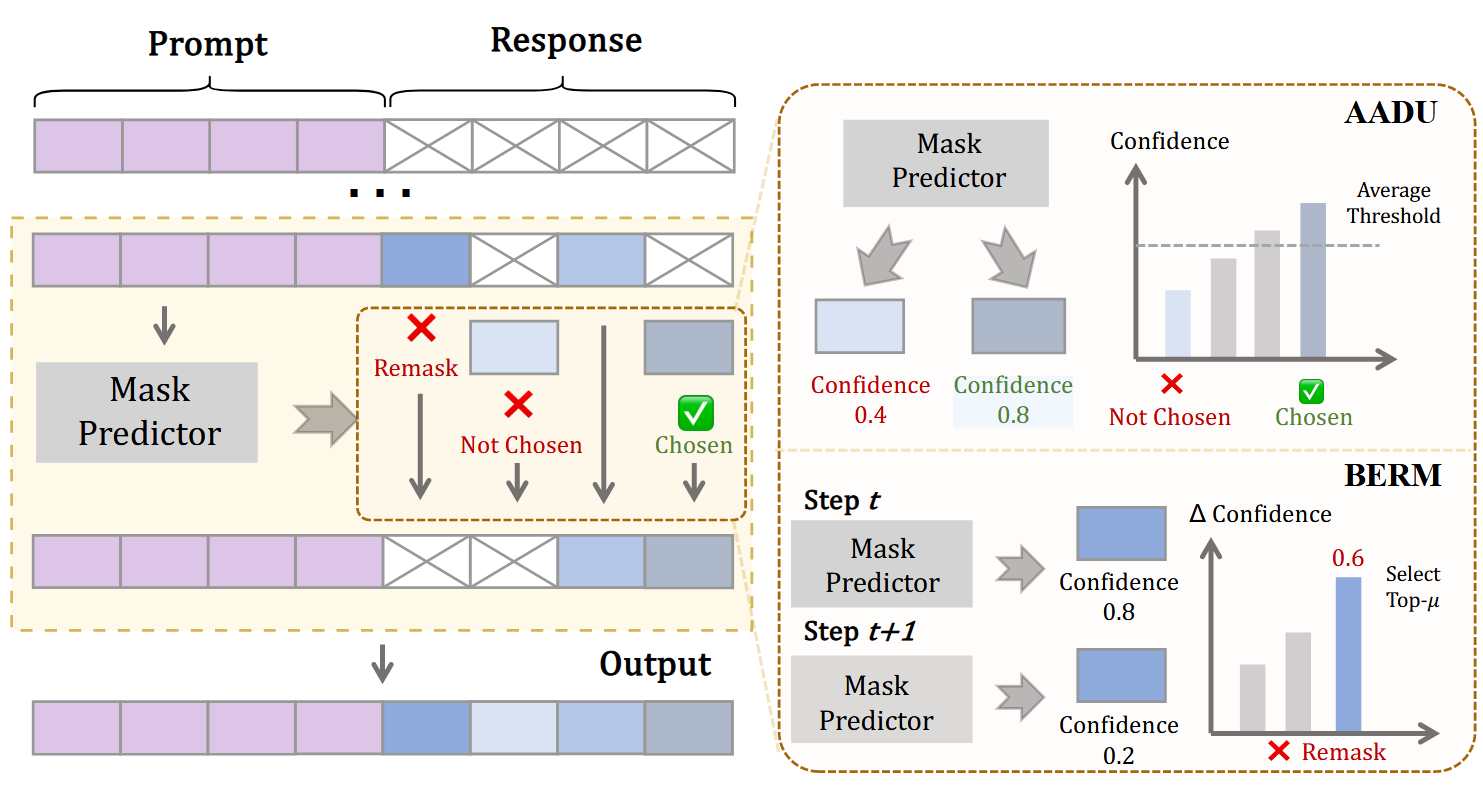 DLM 具有动态的上下文,随着越来越多的[MASK]被解码,DLM 对于已经生成的 token 的置信度会发生变化,DLM 可能会越来越觉得之前生成的某个 token 是错误,但是传统的 DLM 在采样中是不可逆的,无法将一个 unmask 出来的 token 重新 mask