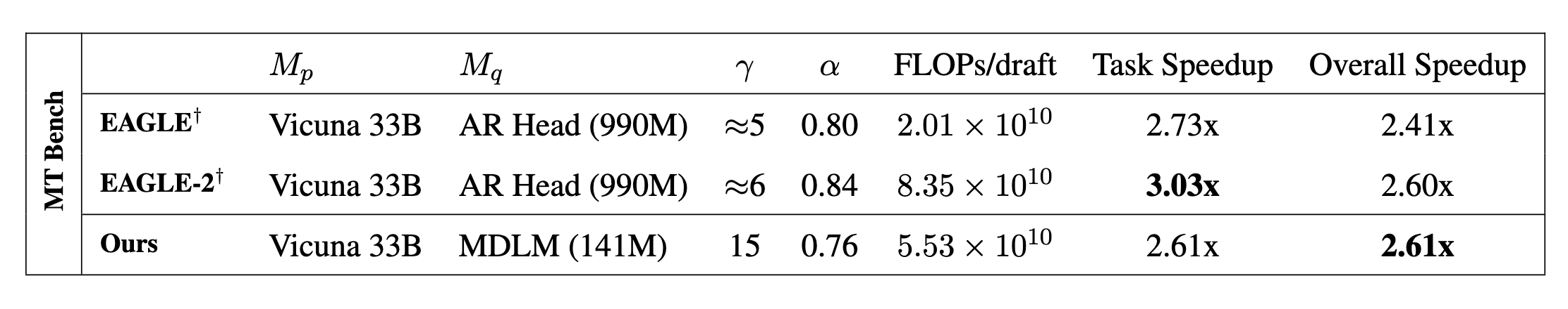 下图中的 Task Speedup 是模型在对应数据集上的加速效果,Overall Speedup 是在所有 Spec-Bench (Xia et al., 2024) tasks 上测量的平均成绩