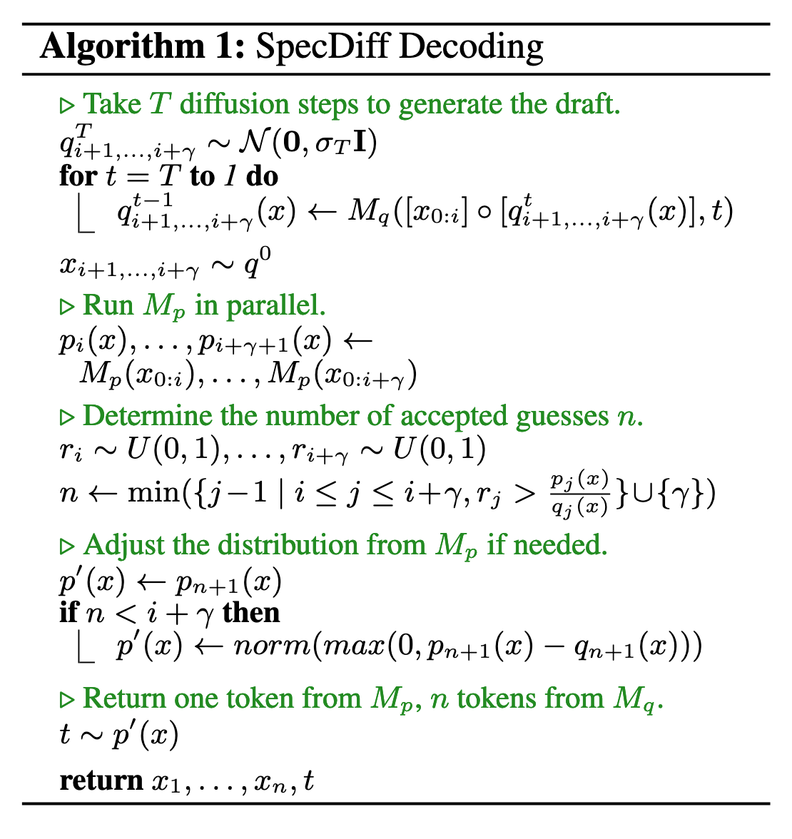 - 否则,对于第 n+1 个位置从调整后的分布中采样一个 token,并回到第一步