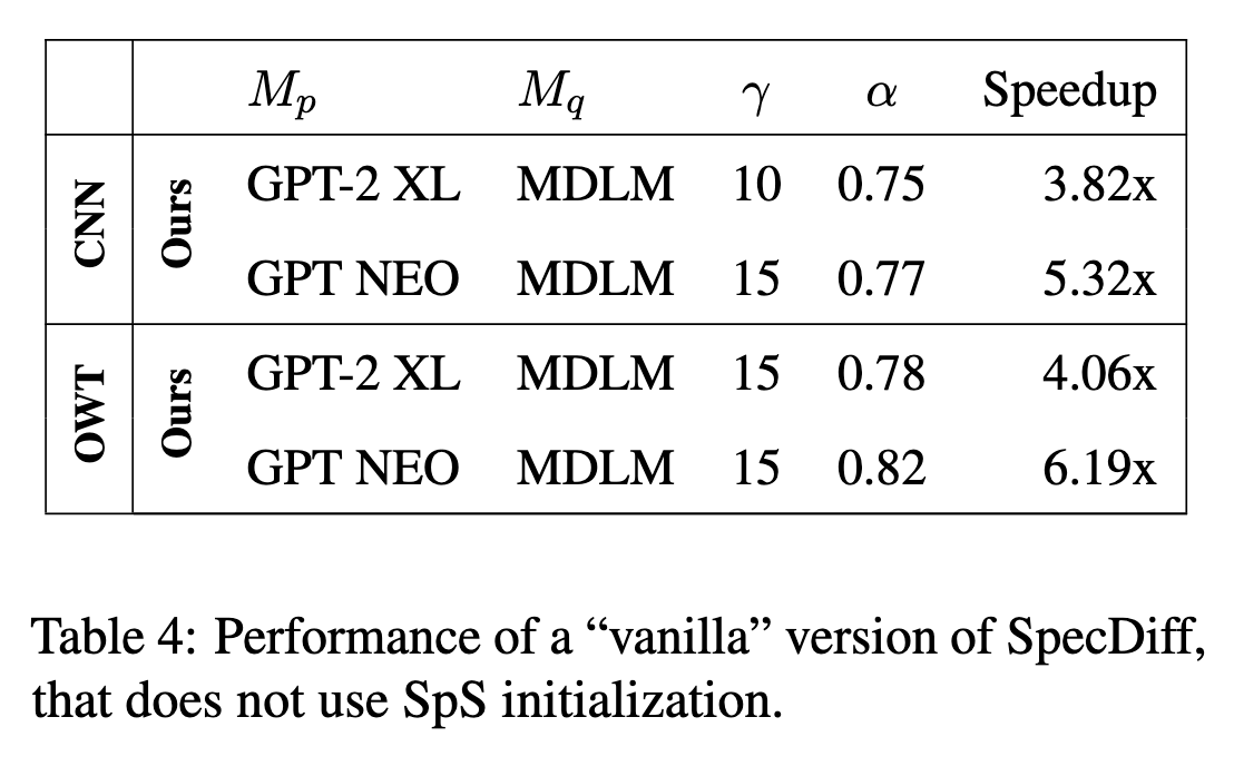 由于 Diffusion 和 Autoregressive 模型大概率不是同一个系列的模型,他们的概率分布可能有较大差异,因此作者又引入了一个方法,即对最初的几个 Token 采用标准的投机采样,从而在一开始就优化了 SpecDiff 的性能